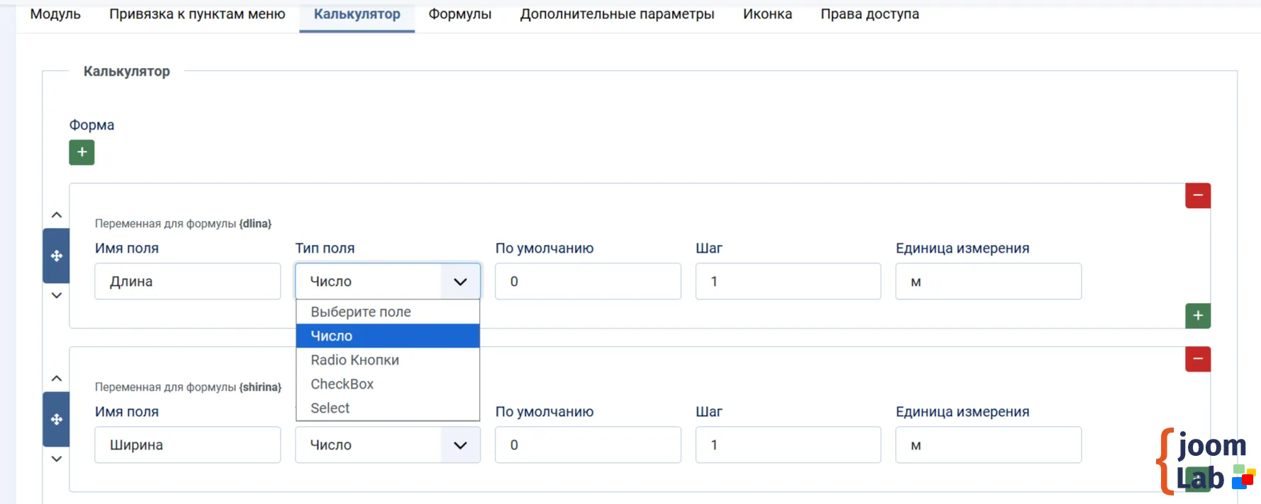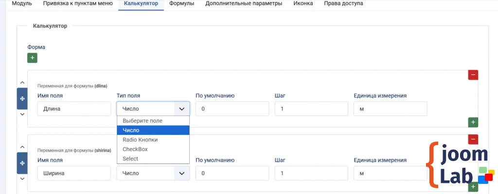 В форме калькулятора, Вы можете создавать разные типы полей:
