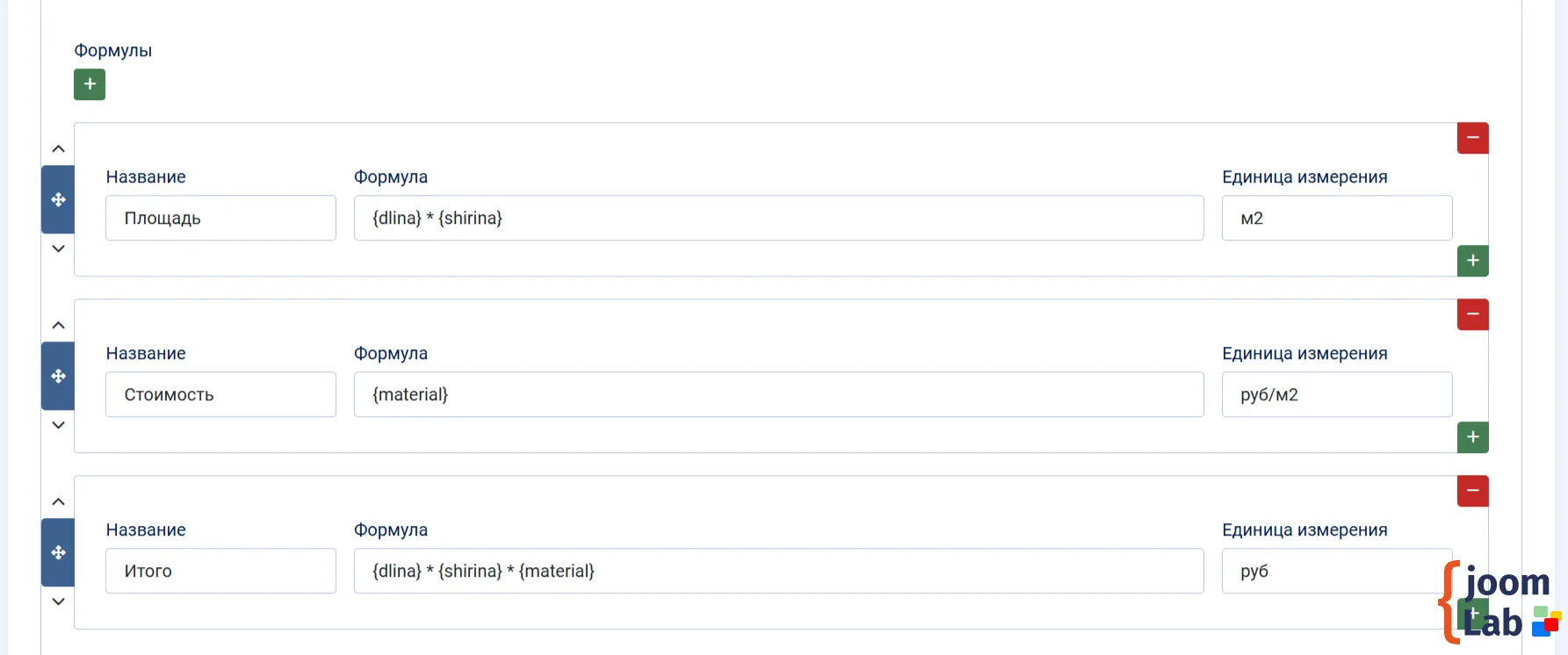 Форма калькулятора и формулы расчета удобно создаются с помощью полей subform.