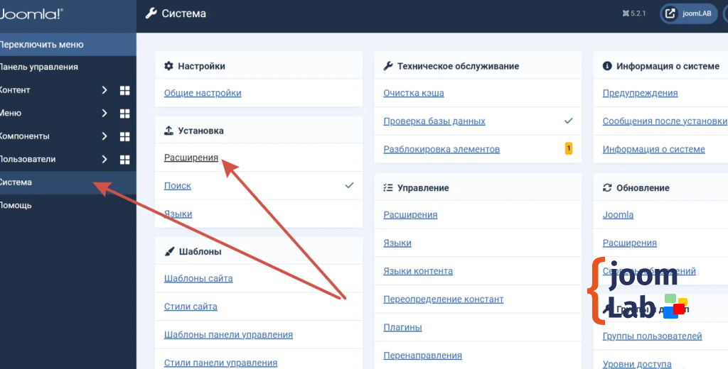 После того, как Вы скачали архив с пакетом плагина, необходимо перейти Система/Установка расширений.